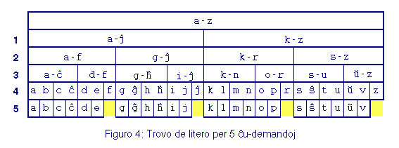Figuro 5 montras simplan "lingvon" kun kvar literoj, kiuj do povus porti log2 4 = 2 bitojn. La plej simpla demando-skemo, cxiam duoniganta la signaron, do bezonas 2 decidojn; sed konsiderante la malsamajn oftecojn de la signoj, oni vidas ke la meza informacio de litero estas nur 1,75 bitoj. La sama fenomeno okazas en homaj lingvoj: Bauer kaj Goos [1] indikas por la germana lingvo kun 26 literoj (+ vorto-limo) mezan informacion de 4,11 bitoj, anstataux log2 27 = 4,75. Sherwood donas en [14, 15] la relativajn oftecojn de la fonemoj en konversacio en Esperanto; laux lia tabelo de du-fonemoj konkludeblas, ke la vorto-limo havis oftecon de cx. 15,2 %, simile kiel en la germana. El tio sekvas meza informacio de 4,10 bitoj / signo, anstataux log2 29 = 4,86 sen konsidero de la oftecoj.