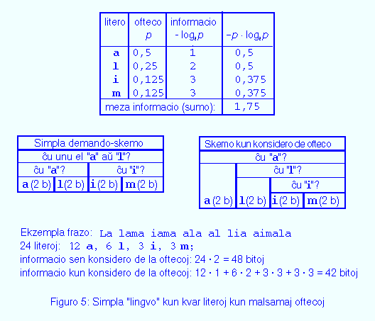 Figuro 4 montras, ke unu litero el la internacialingva alfabeto mezume enhavas informacion de malpli ol 5 bitoj: Laux la demando-skemo en la figuro eblas trovi la literon per maksimume 5 demandoj, parte jam post 4. Se cxiuj literoj estus egale oftaj, ni havus mezan bezonon de (24 * 5 + 4 * 4) / 28 ~ 4,86 demandoj. Se la nombro de signoj estas entjera potenco de 2, n = 2m, kaj se cxiuj signoj havas la egalan relativan oftecon (probablecon) p = 1/n, la per-duoniga demando-skemo estas optimuma kaj bezonas precize m decidojn; do la informacio de cxiu signo estas m = log2 n = - log2 p bitoj. Tiu formulo montrigxas gxeneraligebla ankaux al neegalaj oftecoj.
